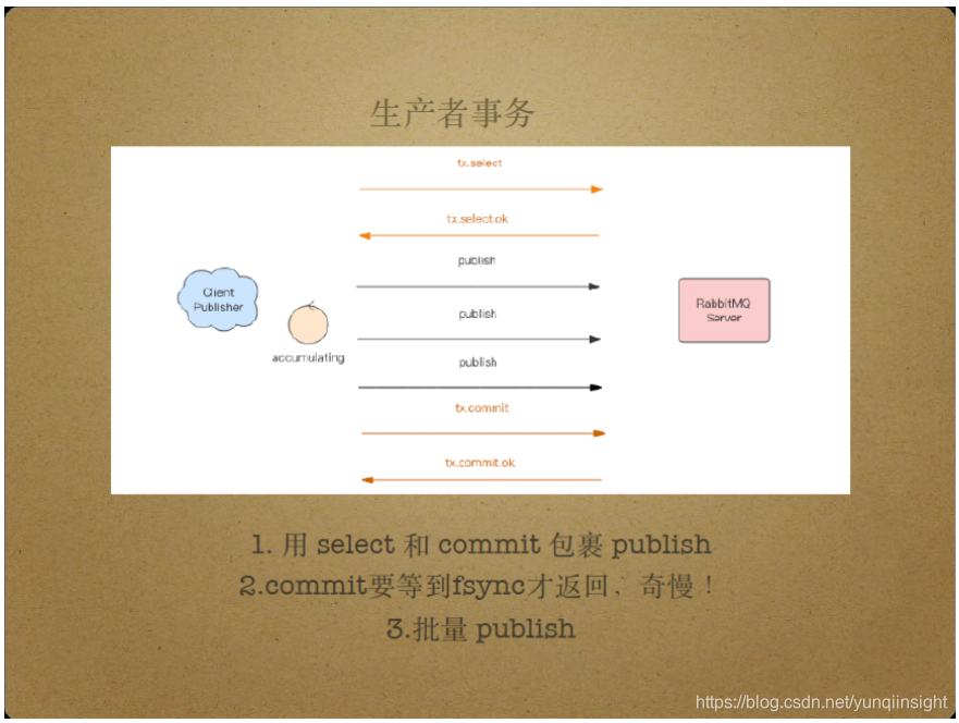 生产者事务的基本原理是采用select和commit指令包裹publish,在消息生产者publish数据之前执行select操作,相当于begin transaction事务开始,在执行若干个publish操作后,再执行commit操作,相当于提交事务。根据tcp包的有序性,commit包成功接收意味着commit包之前的包也成功接收。因此,收到从Client Publisher传递过来的commit包意味着该commit包之前的所有publish包都已成功接收,即所有消息都成功接收。然而,commit包只有等到Server端的fsync操作执行完毕时才返回,因此生产者事务的效率较低,通常只在有批量publish操作时才使用生产者事务模式。也就是说,客户端将消息累计起来批量发送,以降低fsync操作带来的性能损失。此外,在进程中累计消息也存在风险,累计的消息可能由于进程挂掉而丢失。总的来说,生产者事务由于性能缺点不被RabbitMQ官方推荐。