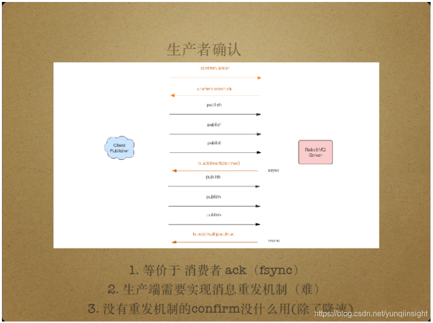 另一种Server带来的数据不可靠问题的解决方案是生产者确认。生产者确认类似于消费端的Ack机制,生产者可能连续发送多条消息,Server将这些消息异步地通过fsync操作写入磁盘再异步地给生产者发送Ack包,告知生产者消息的接收成功。由于Ack包异步传输,不影响生产者端消息的正常发送。生产者确认模式下,Ack包批量发送,并且都携带有序号,以告知生产者该序号以前的所有消息都已正常落盘。尽管RabbitMQ推荐用户使用生产者确认模式,目前的RabbitMQ版本还未实现消息的重发机制,只实现了Ack包的批量发送,以通知Client Publisher哪些消息接收成功。当消息丢失时,Client Publisher端已publish的消息在进程挂掉时也可能丢失,而不是重新发送,因此生产者确认的作用也不明显。当然,生产者确认起到了降低消息发布速度的作用,减小了消息丢失的数量。