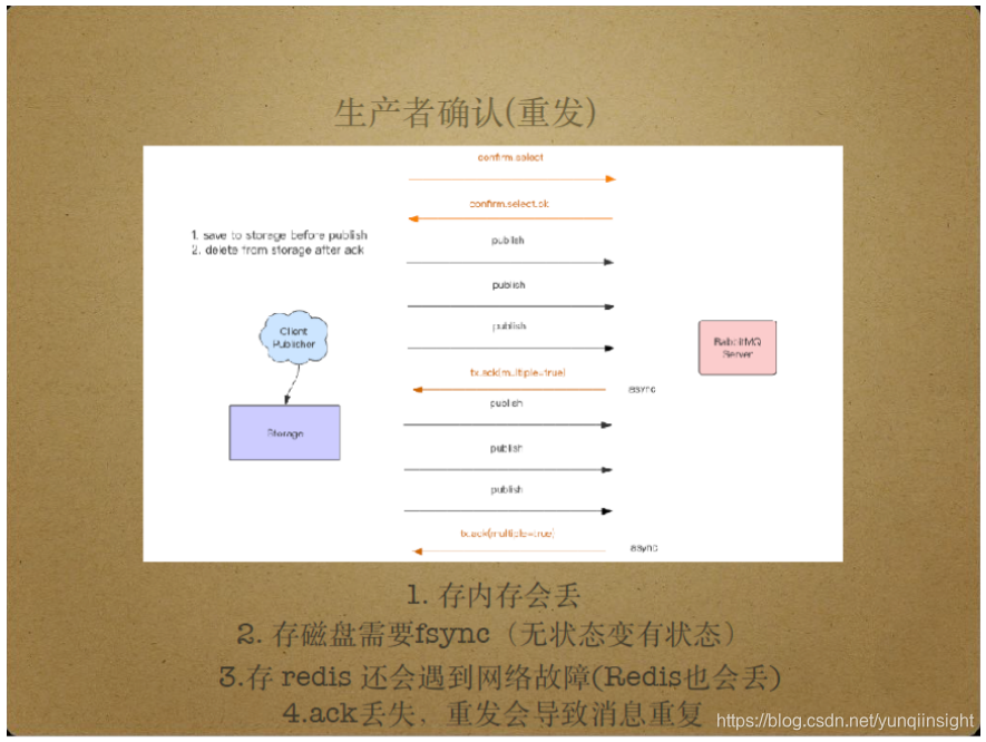 生产者确认中的消息重发可以通过以下几种方法实现。第一种方式在内存中累积还未收到Ack包的消息,收到Ack包后删除该消息,对于一段时间内还停留在内存中的消息,重发该消息。这种方式将未Ack消息存入内存,一旦消息生产者宕机,这些消息也会丢失。另一种方式将未收到Ack包消息存入磁盘,当收到Ack包后删除该消息,然而,磁盘存储依赖于fsync操作,降低了系统处理消息的性能。同时,这还会提高编程的复杂度,因为这要求发布消息时维护文件队列,还要求一个异步线程将文件队列中的消息发布到Server,带来了多线程和锁问题。还有一种方式将未Ack消息存入Redis,但当出现网络故障时,Redis也是不可靠的。目前提供的生产者确认中的消息重发方案都还存在问题,具体的方案选择依赖于实际场景和个人取舍。