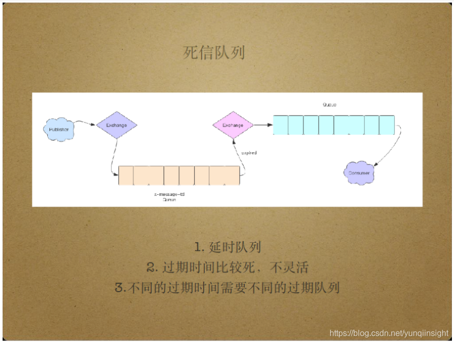 死信队列的工作方式如上图。Client Publisher将消息投递给路由器,也就是exchange,再由exchange将消息投递给队列,由队列生成该消息的构建时间,到达构建时间的消息将过期,同时进入死信队列。过期消息进入死信队列的方式和进入普通队列的方式基本一致,即先投递给exchange路由器,再由exchange投递消息。消费者消费死信队列,得到的消息是延后的消息,延迟的时间长度即构建时间。目前,死信队列存在的问题是,一个队列只能设置一个构建时间,消息的过期时间不够灵活,不能满足一些特殊场景的需求,比如动态的重试时间。