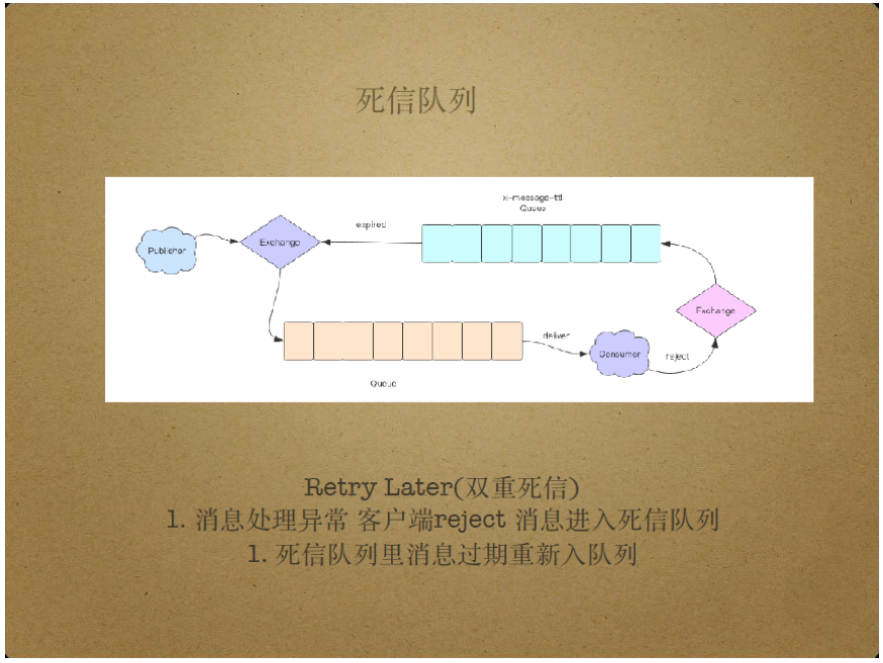 死信队列的另一个使用场景是Retry Later,即在一段时间后才重新处理此前处理失败的消息,这时可能用到双重死信。具体来说,死信队列不仅可以接收过期消息,还可以接收被reject的消息,即消费端拒绝处理或处理过程发生异常的消息,Reject操作具有requeue参数,当requeue设为true时被reject消息会重新进入消息队列并被重新投递,当requeue设为false时被reject消息将进入死信队列。假如死信队列持有构建时间,那么到达构建消息的消息将重新投递给原有队列,实现Retry Later。双重死信在使用过程中需注意消息处理的死循环问题,因为消息可能无限循环地进入死信队列。