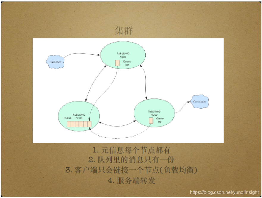 生产环境下,RabbitMQ通过使用集群模式。集群模式下,只有元信息分布在所有节点中。元信息指队列信息,路由器信息等,队列中的信息只存储在一个节点中,因此,单个节点宕机会导致所有节点都不可用。另外,RabbitMQ的所有节点间存在转发机制,即允许节点转发其他目标节点的消息处理请求,这样客户端只需连接到任意一个节点就可以实现其消息转发需求。