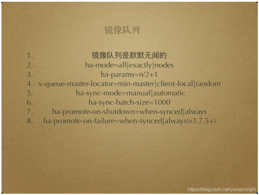 - Ha-sync-mode用于镜像节点代替宕机主节点并创建新节点以弥补缺失节点时,设置新节点上数据的同步策略。automatic指自动地将新主节点上数据全部同步给新节点,manual指不同步新主节点上的老数据,只同步新产生的数据。由于节点间数据同步需要耗费时间,长时间的数据同步可能会影响服务的稳定性,但通常情况下RabbitMQ的节点堆积的数据量并不大,因此RabbitMQ官方推荐使用Automatic进行数据同步。