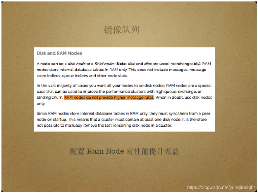 许多公司为RabbitMQ集群设置了内存模式,认为内存模式无需落盘,能够提升系统性能。但实际上,RabbitMQ官方文档指出,内存模式无法提升系统性能,它只提升了产生元信息数据的速度,即Ram Node指将元信息存入内存,可以提升元信息的创建速度,而不是消息数据的性能。这是使用RabbitMQ时的一个常见误区。