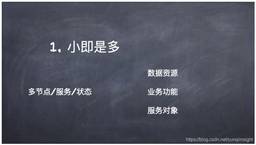 当业务从大变小的时候,也意味着业务变多了。由大变小,可以使系统变得更加容易维护和修改,但是由少变多,又会使得问题更加复杂,因此也会有很多的挑战。第一个问题就是多节点、多服务和多状态。系统中的节点、组件服务变得更多了,那么节点和服务之间的状态也会变得更难维护,更加复杂。基于前面提到的四种知识,其实可以将从大变小和从少变多这两个转变进行折中,使得其变得更加可控。而解决这个问题的关键在于对于服务的合理拆分,主要有三点可以考虑,即数据资源、业务功能以及服务对象。