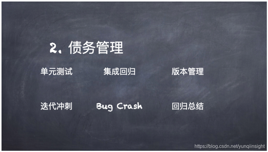 比如Bug、代码缺陷、未完成的功能或者版本不兼容等问题都是债务。当服务变得越来越多的时候,债务往往就会变得更多。为了解决这些问题,其实有这样的几种策略,比如单元测试,如果单元测试做的足够好,那么代码缺陷的可能性就会变得更低一些,可以将服务由少变多所造成的债务变多情况进行收敛;集成回归,这部分提供了很多工具去做这件事情,不用开发者自己去做;版本管理,这里指的是静态库的版本管理,动态库指的是正在变更中的库,而静态库指的是不再变更的库和配置项,这一点控制不好,就容易使得系统管理混乱;迭代冲刺,这是一种组织方式,当有很多技术债务需要进行管理时,如何将这些债务一点点处理掉或者把发散的趋势收敛住,迭代冲刺就是一种做法;Bug Crash,这是智慧云团队自己发明的一个名词,相当于是对于Bug的大扫除,无论采用传统的还是敏捷的开发模式,都有一些Bug存在,因此定期会组织全体开发和测试以及产品将自己的产品用一遍,进行Bug大扫除;回归总结,无论采用什么开发模式,在一个迭代周期完成之后,回归总结是少不了的,也需要通过一些方法解决新发生的问题,或者将其封闭住不使债务继续蔓延。