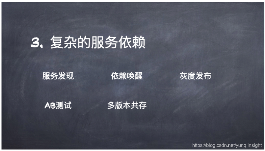 如果只有一个或者几个组件,那么其实不存在服务依赖问题,而如果有几千个组件,那么服务依赖将会成为巨大的问题。举例而言,如果用户服务需要调用订单服务,那么在启动的时候需要进行一些初始化任务,那么一个服务的版本发布可能导致系统全面瘫痪,这就是复杂服务依赖问题。为了解决这个问题首先就需要服务发现机制,比如使用etcd或者Zookeeper等,首先服务发现中心也需要是分布式高可靠的,那么服务起来之后需要把自己的名字和调用方式告诉服务发现中心,注册上去,对于服务调用者而言只需要从服务发现中心那里通过约定好的名字获取服务调用地址即可。依赖唤醒是有一个相对比较新的东西,比如大流量突然打进来的时候,A服务需要从原来的10个启动到100个,而B从原来的3个肯定也是不够用的,因此需要通过唤醒的机制将服务拉起来,而不是被动的被通知。还有一种情况也需要使用到依赖唤醒机制,比如缓存穿透问题,正常情况下,缓存是生效的,不会存在穿透的情况,但是可能因为某种异常使得缓存不生效了,会将大量的流量打到DB里面去,使得服务变得不可用了,整个服务雪崩掉,针对这些问题一般会开发一些挡板服务,可能会给出一些固定的数据,而这些挡板服务也有可能会面临这种突发的流量也需要通过依赖唤醒的机制实现唤醒。此外,还有灰度发布和AB测试,这两点是相关联的。还有多版本共存问题,对于服务的多版本也是一个技术债务问题,需要考虑如何将其旧版本拿下来。