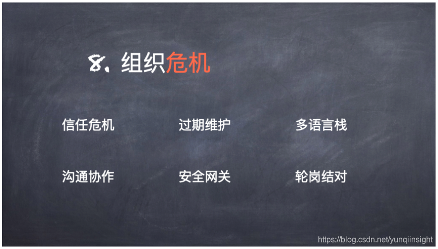 最后一个问题,也是最大的问题。其实要实现向微服务架构的变更的时候,最大的问题就是组织危机。这一点与开发者关系不大,但是对于Team Leader以及组织的管理人员而言,关系就非常大了。架构的转变需要考虑到信任危机、过期维护、多语言栈、沟通协作、安全网关以及轮岗结对等问题。