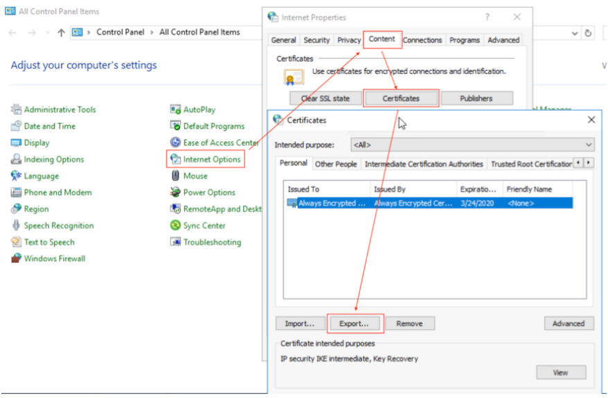 Control Panel –> Internet Options -> Content -> Certificates -> Export。如下图所示: