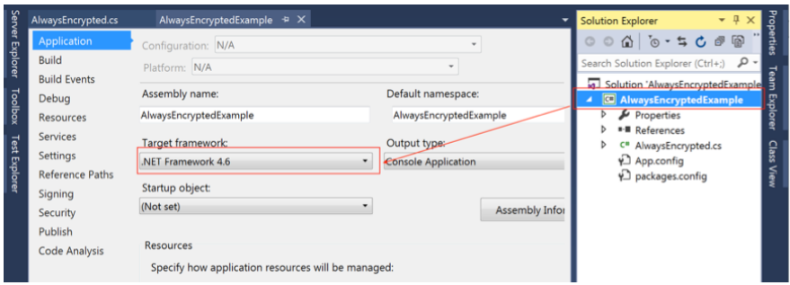 注意:仅.NET 4.6及以上版本支持Always Encrypted特性的SQL Server driver,因此,请确保您的项目Target framework至少是.NET 4.6版本,方法如下:右键点击您的项目 -> Properties -> 在Application中,切换你的Target framework为.NET Framework 4.6。