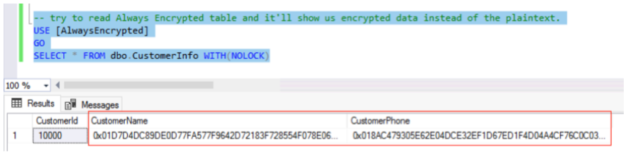 -- try to read Always Encrypted table and it'll show us encrypted data instead of the plaintext.