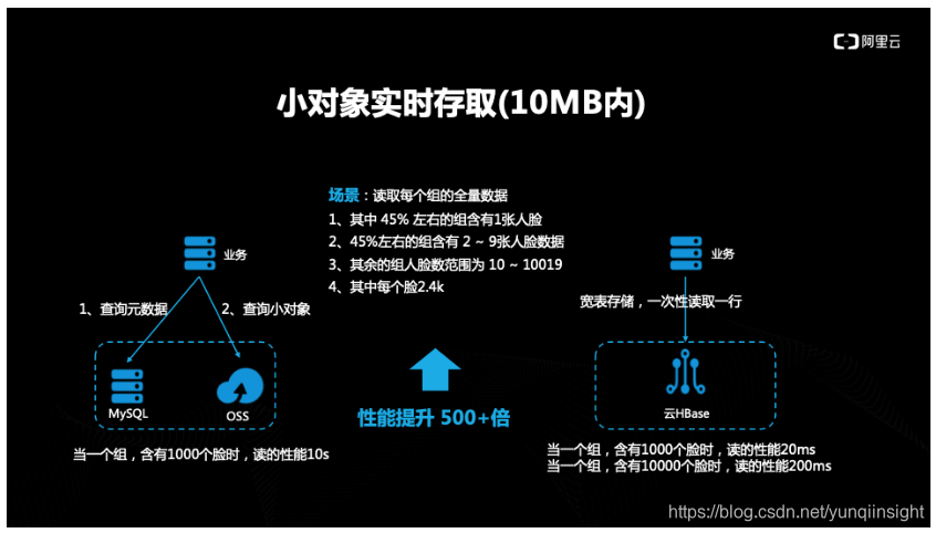 很多人工智能,多媒体场景,在线教育里面,大量图片、小视频文件。传统的使用方法都是存在OSS里面,OSS天然并发和时延处理能力有限,同时读写都是要收费的,读写次数越多,费用越高,使用HBase X-Pack没有这部分的费用,可以解决性能的瓶颈的同时,带来综合成本的降低。