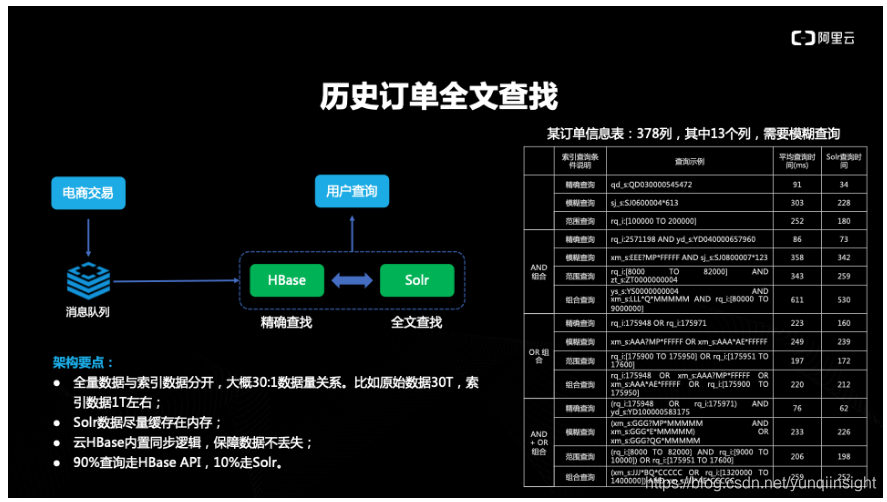 - 碰到非结构化数据查询的诉求时,大家一般会想起ES。ES适合文本查询,入库会比较差(一般就几百条/S),查询函数也有限。HBase X-Pack通过支持Solr完全补齐了文本查询的能力。同时Phoneix+solr组合结合了HBase和搜索的两者的优势,在吞吐和并发上有优势。对SQL的易用性也有优势。尤其是在新零售等场景,一张表中混杂结构化字段和非结构化字段,可以根据需求,自动创建索引,融合两者的优势。倒排膨胀率很高,入库会极速下降。大部分客户只是部分字段有模糊查询的需求,ES强制所有的用单一技术。Phoneix非常适合并发高的查询,条件不多。搜索技术补充了索引技术,适合各种条件。通过结合phoneix+solr成功平滑查询和存储性能,提高性能的同时,存储成本也下降几倍,非常适合结构化+非结构化混合的场景。