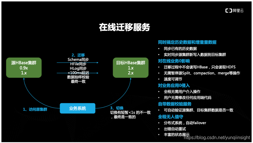 客户已经使用ECS自建服务,想使用云HBase服务,最担心的应该还是迁移过程中对业务的影响,技术团队充分考虑这一点,提供免费的不停机迁移服务,对在线业务0影响,数据迁移一行不丢。当前业界有能力提供不提供不停机迁移HBase服务的仅此一家。