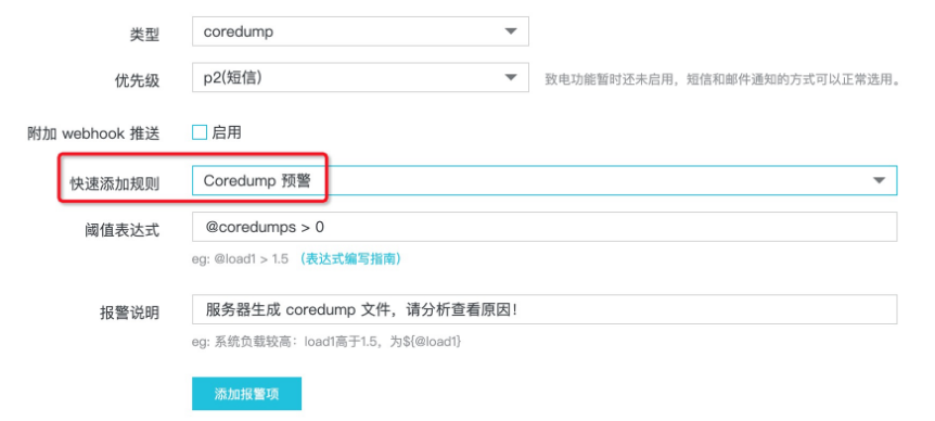 那么我们如何来感知到这里的错误的呢?这里我们的服务器配置过了 ulimit -c unlimited ,因此 Node.js 应用 Crash 的时候内核会自动生成核心转储文件,而且性能平台目前也支持核心转储文件的生成预警,这一条规则目前也被放入了预设的快速添加告警规则中,可以参考工具篇中 Node.js 性能平台使用指南 - 配置合适的告警 一节,详细的规则内容如下所示: