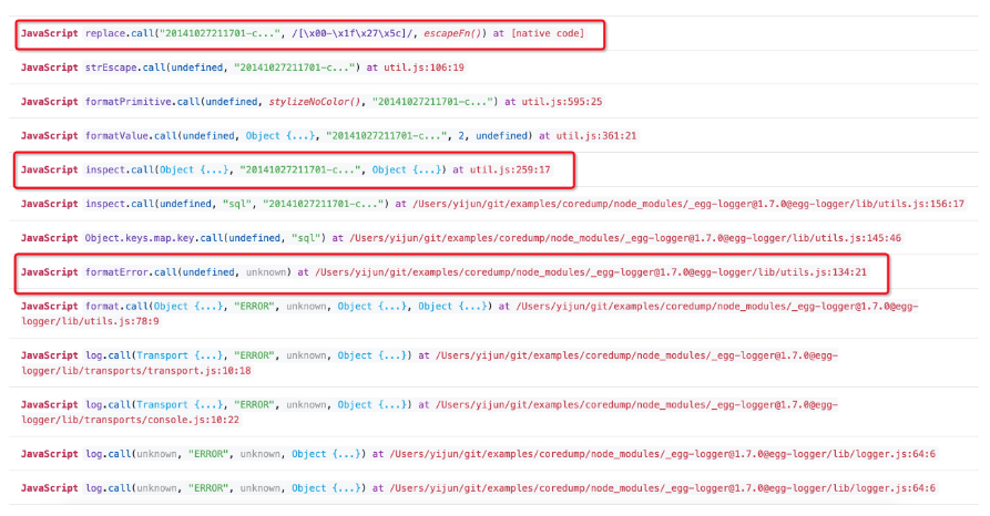这样我们就知道了线上 Node.js 应用在 Crash 的那一刻正在使用 require('util').inspect 对某个字符串进行序列化操作。