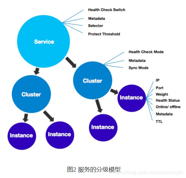 Zookeeper没有针对服务发现设计数据模型,它的数据是以一种更加抽象的树形K-V组织的,因此理论上可以存储任何语义的数据。而Eureka或者Consul都是做到了实例级别的数据扩展,这可以满足大部分的场景,不过无法满足大规模和多环境的服务数据存储。Nacos在经过内部多年生产经验后提炼出的数据模型,则是一种服务-集群-实例的三层模型。如上文所说,这样基本可以满足服务在所有场景下的数据存储和管理。