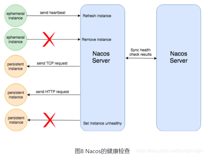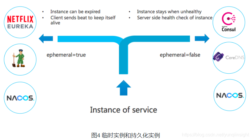 Nacos 1.0.0介绍的另外一个新特性是:临时实例和持久化实例。在定义上区分临时实例和持久化实例的关键是健康检查的方式。临时实例使用客户端上报模式,而持久化实例使用服务端反向探测模式。临时实例需要能够自动摘除不健康实例,而且无需持久化存储实例,那么这种实例就适用于类Gossip的协议。右边的持久化实例使用服务端探测的健康检查方式,因为客户端不会上报心跳,那么自然就不能去自动摘除下线的实例。