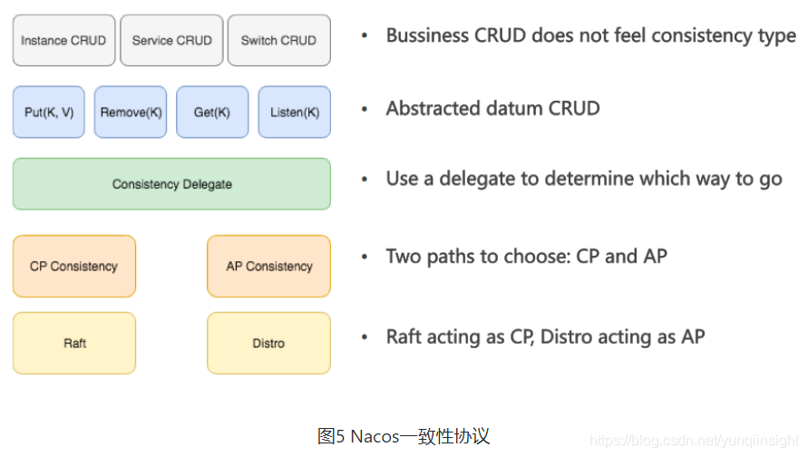 Nacos因为要支持多种服务类型的注册,并能够具有机房容灾、集群扩展等必不可少的能力,在1.0.0正式支持AP和CP两种一致性协议并存。1.0.0重构了数据的读写和同步逻辑,将与业务相关的CRUD与底层的一致性同步逻辑进行了分层隔离。然后将业务的读写(主要是写,因为读会直接使用业务层的缓存)抽象为Nacos定义的数据类型,调用一致性服务进行数据同步。在决定使用CP还是AP一致性时,使用一个代理,通过可控制的规则进行转发。