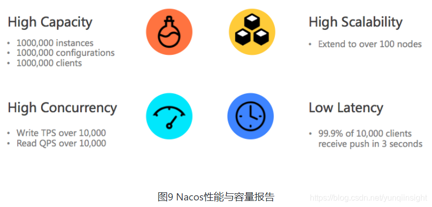 Nacos在开源版本中,服务实例注册的支撑量约为100万,服务的数量可以达到10万以上。在实际的部署环境中,这个数字还会因为机器、网络的配置与JVM参数的不同,可能会有所差别。图9展示了Nacos在使用1.0.0版本进行压力测试后的结果总结,针对容量、并发、扩展性和延时等进行了测试和统计。