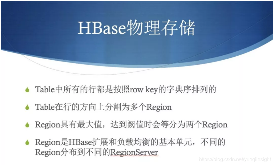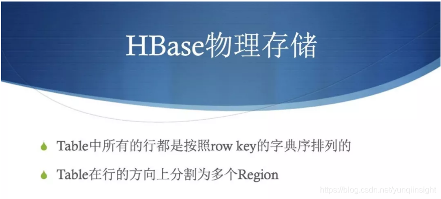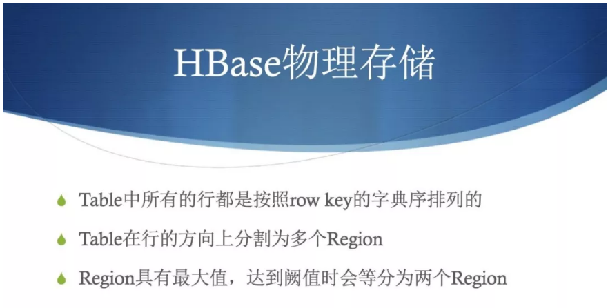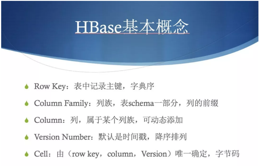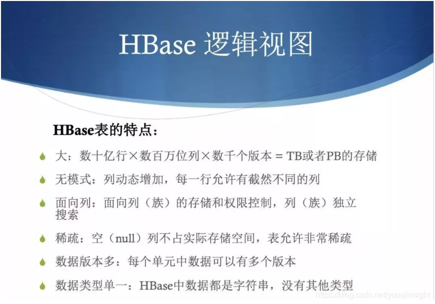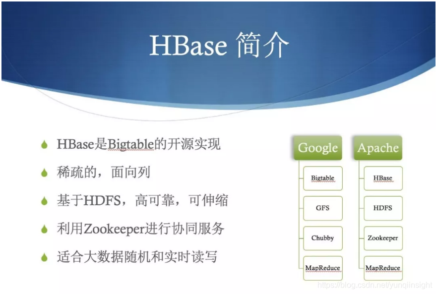Google 的三架马车 BigTable、GFS、MapReduce 现在在开源社区中都能找到对应的实现。HBase 就是 Bigtable 的开源实现,当然这句话不是完全正确,因为两者之间还是有些差异的。但是主要还是基于 BigTable 这个数据模型开发的,因此也是具有 Key-Value 特征的,同时也就具有 Bigtable 稀疏的、面向列的这些特性。