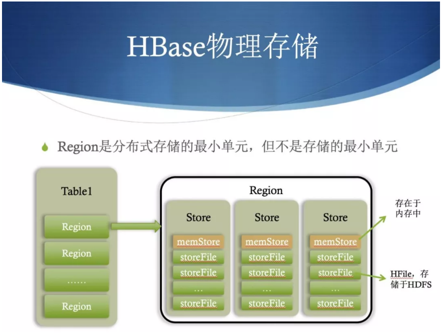 Store 又是由一个 memStore 和 0 个或者多个 storeFile 组成。memStore 是存储在内存中,storeFile 是存储在 HDFS 中,有时候也称作 HFile。数据都会先写入memStore,一旦 memStore 超过给的的最大值之后,HBase 就会将memStore 持久化为 storeFile。