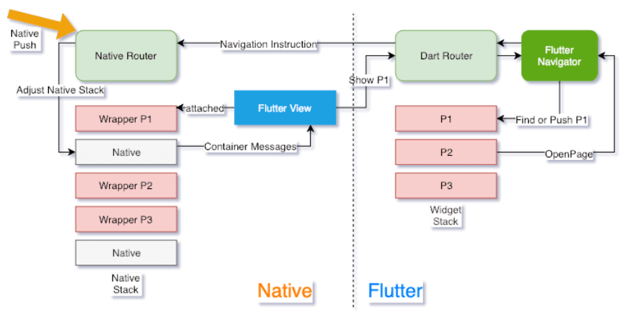 那么在FlutterBoost的概念里说到页面的时候,我们指的是Native容器和它所附属的Widget。所有页面路由操作,打开或者关闭页面,实际上都是对Native页面容器的直接操作。无论路由请求来自何方,最终都会转发给Native去实现路由操作。这也是接入FlutterBoost的时候需要实现Platform协议的原因。