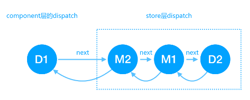 首先还是component中的dispatch D1 会被执行,然后传递给store的dispatch,而此时store的dispatch已经经过中间件的增强,所以会执行中间件的处理函数,最终store的原始dispatch函数D2会被执行。