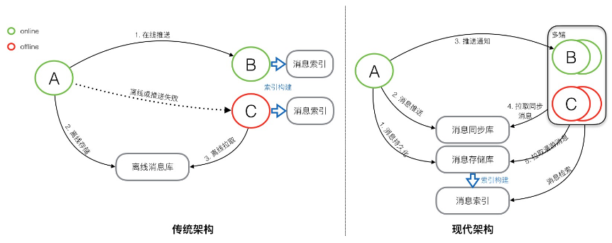 传统架构下,消息是先同步后存储。对于在线的用户,消息会直接实时同步到在线的接收方,消息同步成功后,并不会在服务端持久化。而对于离线的用户或者消息无法实时同步成功时,消息会持久化到离线库,当接收方重新连接后,会从离线库拉取所有未读消息。当离线库中的消息成功同步到接收方后,消息会从离线库中删除。传统的消息系统,服务端的主要工作是维护发送方和接收方的连接状态,并提供在线消息同步和离线消息缓存的能力,保证消息一定能够从发送方传递到接收方。服务端不会对消息进行持久化,所以也无法支持消息漫游。消息的持久化存储及索引同样只能在接收端本地实现,数据可靠性极低。