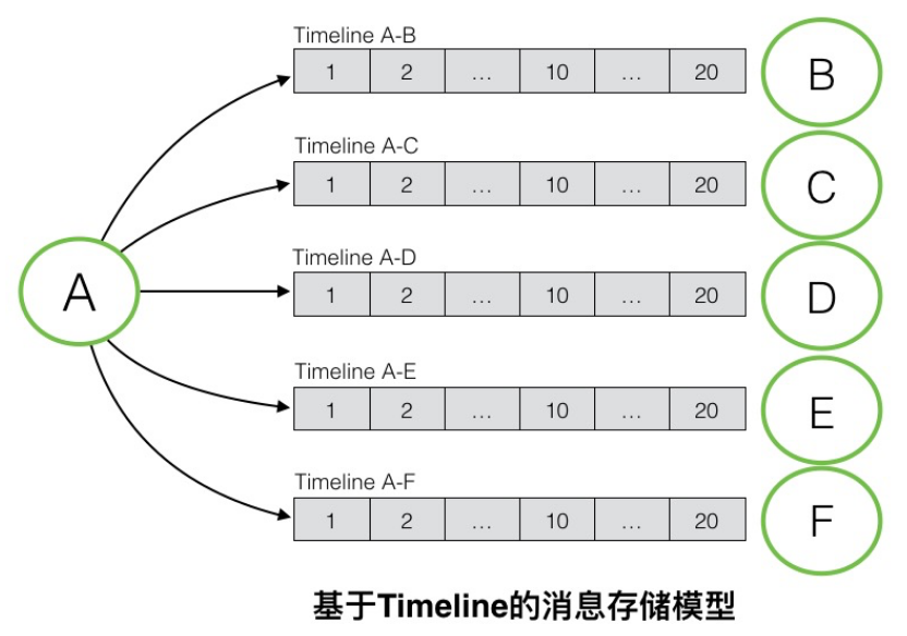 如图是基于Timeline的消息存储模型,消息存储要求每个会话都对应一个独立的Timeline。如图例子所示,A与B/C/D/E/F均发生了会话,每个会话对应一个独立的Timeline,每个Timeline内存有这个会话中的所有消息,消息根据会话顺序排序,服务端会对每个Timeline进行持久化存储,也就拥有了消息漫游的能力。