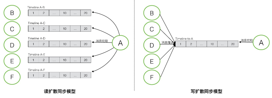 消息同步模型会比消息存储模型稍复杂一些,消息的同步一般有读扩散(也叫拉模式)和写扩散(也叫推模式)两种不同的方式,分别对应不同的Timeline物理模型。