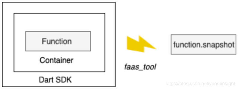 在前面我们提到过Dart版本的FaaS语言容器,为追求极致的研发体验,我们需要缩短用户Function打包到部署运行的时间。就语言容器层面而言,Dart提供的Snapshot技术可以大大提升启动速度,但是从用户Function到Snapshot(如下图)生成所产生的编译时间在不做优化的情况下超过10秒,还远远达不到极致体验的要求。我们这里通过一些测试,来寻找提升性能的途径