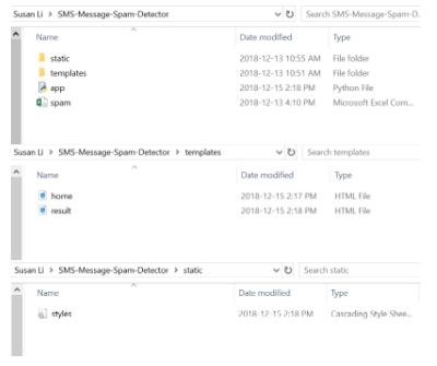 首先,我们为这个项目创建一个名为SMS-Message-Spam-Detector 的文件夹,这是该文件夹中的目录树,接下来我们将解释每个文件。