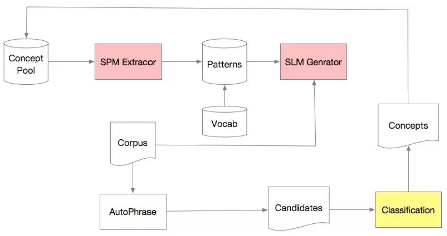 Concept Mining主要分为两步,一个是候选生成(Candidate Generation),另一个是概念正确性判断(Concept Classification)。总体流程如下: