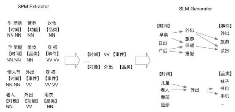 在明确了定义和基本原则之后,我们需要挖掘大量的concept用以覆盖各式各样的用户需求。目前,我们认为用户在使用淘宝或天猫搜索时输入的搜索词(query)和商品的标题(title)是concept挖掘可以利用的最大来源。而我们的工作主要是要将满足我们上述原则的concept短语,从充满噪音的query、title中挖掘出来,这一步称为“Concept Mining”。