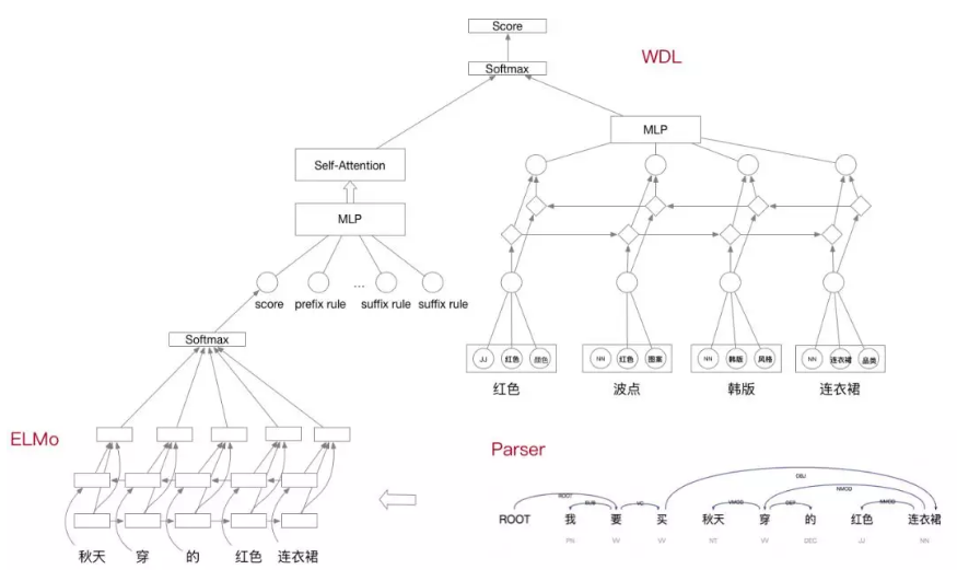 我们一方面结合一些简单的规则进行特征抽取,另一方面,利用现有的序列特征训练Wide&Deep model,来进行concept的合理性判断。在初始数据的处理方面,由于我们大部分的concept都是短文本,而query和title中大部分的term序列不符合正常的语序,我们还利用长文本的parsing infomation进行候选抽取和截断,训练了ELMo作为基础的语言模型,并在同样长度的gram内调整语序,来得到最佳的序列信息再给判别模型。