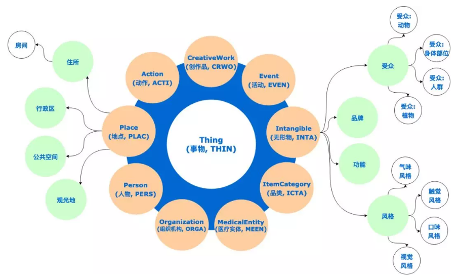 在这里,我们参考Schema.org、cnSchema.org中对客观事物进行描述的结构,建立了以事物类(Thing)为根节点的电商知识图谱底层本体分类体系。在事物类的子类中,包括“动作”、“创作品”、“活动”、“无形物”、“品类”、“医疗实体”、“机构”、“人物”、“地点”共9大类。每一个子类又有其自己的子类,每一个子类将继承父类的所有属性和关系。具体结构如下图所示: