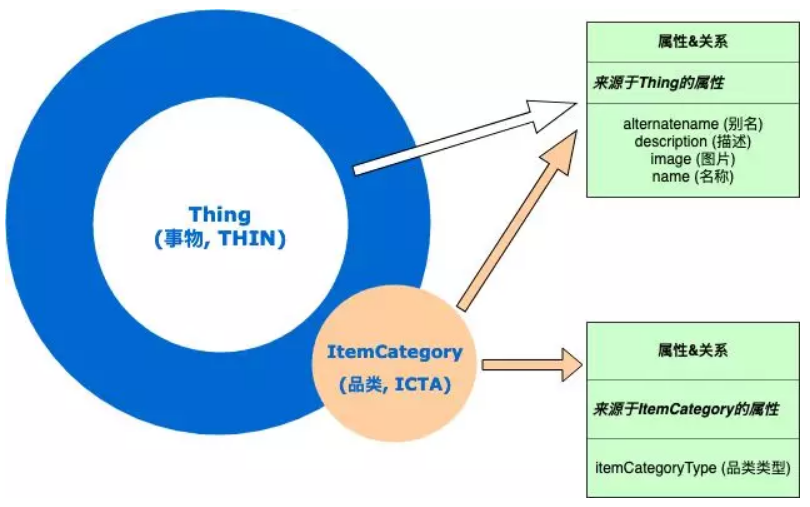 属性是词汇固有的属性,比如“别名”、“描述”等;关系是本体词汇之间存在的客观联系,如Person类中实例的“出生地”将链接到另外一个Place类的实例中。在本体的分类体系中,每个类别都有其特有的属性和关系,子类将继承父类所有的属性和关系。在这里,我们以事物类和品类类为例,介绍属性和关系,具体如下图所示: