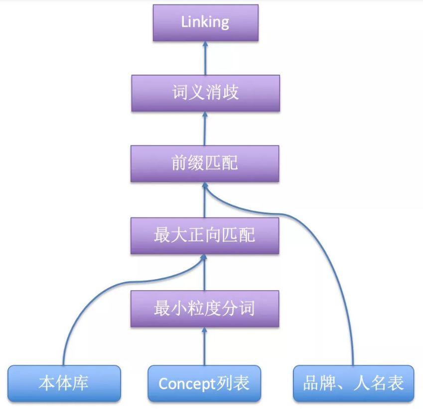 1) 基于词典的最大正向匹配及前缀匹配:给定一个concept,算法首先使用最小粒度分词,将concept切分成词,然后使用最大正向匹配算法,从左到右将分词后的concept的几个连续词与本体库的词典匹配,如果匹配上则返回本体词汇及类型(ID)。