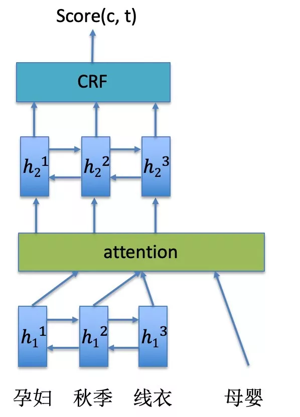 2)词义消歧: 与常规的消歧方法不同,concept通常由短文本组成,上下文能够提供的信息十分有限。因此我们选用了序列标注模型来学习词汇类型的组合,例如:“对象”+“风格”+“品类”等等。由于考虑到不同行业下,词汇的类型不同,例如,“拼接”这个词,在“服饰”领域下,“拼接针织连衣裙”中的“拼接”类型为“风格”,而在“家具灯具”领域中,“拼接水管”的类型为“功能”,因此我们使用了attention机制来学习领域相关的信息。序列标注的模型如下图所示: