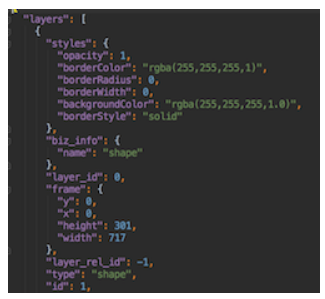 这些资讯主要描述了这个图层(Layer)的范围(Frame)、是什么样子的类型(Type)、是什么样子的样式(Styles)、含有哪些数据(Value)等等。图层集(Layers)栏位则代表了这张视觉稿的所有图层。