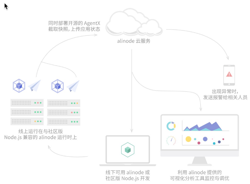 Node.js 性能平台其实简单的说由三部分组成:云控制台 + AliNode runtime + Agenthub,如下图所示: