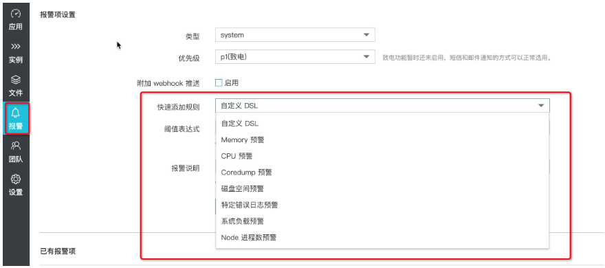 实际上快速添加规则列表中给大家提供的是最常见的一些预配置好的告警策略,如果这些尚不能满足你的需求,更多定制化的自定义的服务告警策略配置方法可以看官方文档 报警设置。并且除了短信告警,也支持钉钉机器人推送告警消息到群,方便群发感知线上 Node.js 应用态势。
