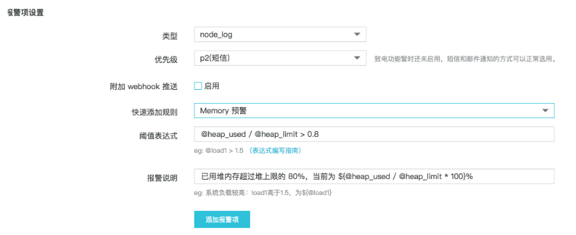 在 Node.js 性能平台 的告警页面上有 快速添加规则,点开选中后会自动生成告警规则的阈值表达式模板和报警说明模板,我们可以按照项目实际监控需求进行修改,比如想要对 Node.js 进程的堆内存进行监控,可以选中 Memory 预警 选项,如下图所示: