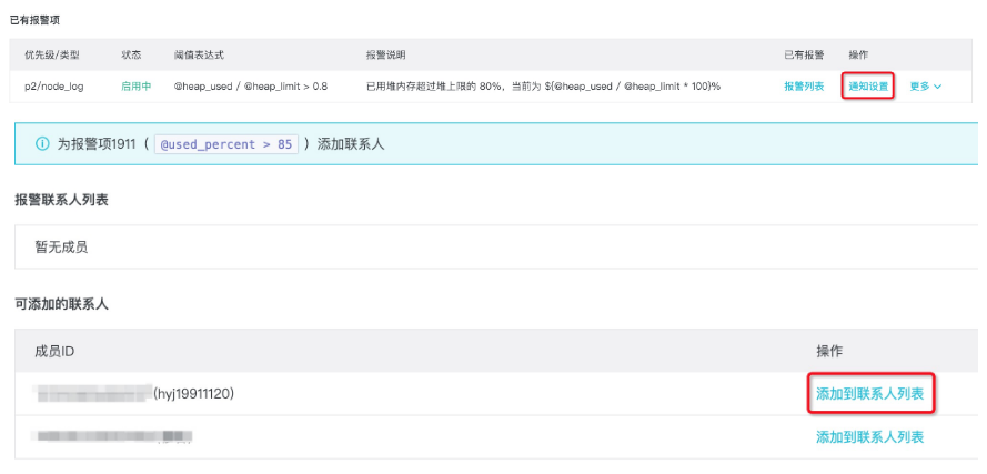 此时点击 添加报警项 即完整了对进程堆内存的告警,并且将出现告警时需要点击 通知设置->添加到联系人列表 来添加的联系人加入此条规则,如下图所示: