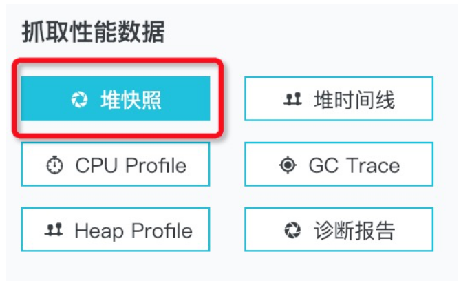 与 CPU 高的问题一样,当我们收到 Node.js 应用进程的堆内存占据堆上限的比率超过我们设置的阈值时,我们也不需要类似 heapdump 这样的第三方模块来导出堆快照进行分析,我们还是在控制台对应的 实例 点击 堆快照 按钮即可生成对应 Node.js 进程的堆快照: