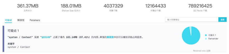 简单了解了概览信息的含义后,接着我们来看对于定位 Node.js 应用代码段非常重要的信息,第一个是默认展示的 可疑点 信息,上图中的内容表示 @15249 这个对象占据了堆空间 97.41% 的内存,那么它很可能就是一个泄漏对象,这里又存在两种可能: