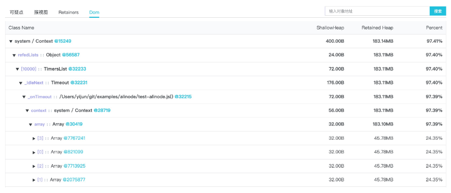 而在实际生产环境的堆快照分析下,很多情况下簇视图下的父子关系在真实的堆空间中并不存在,那么就不会有这些紫色的边信息展示,这时候我们想要知道可疑泄漏对象如何通过 JavaScript 生成的对象间引用关系引用到后面真正占据掉堆空间的对象(比如上图中的 40 多兆的 Array 对象),我们可以点击 可疑节点自身的地址链接 :