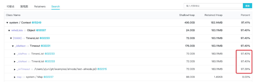 这个视图因为反映的是堆空间内各个 Heap Object 之间真正的引用连接关系,因此父对象的 Retained Size 并不能直接由子节点的 Retained Size 累加获取,如上图红框内的内容,显然这里的三个子节点 Retained Size 累加已经超过 100%,这也是 Search 视图和簇视图很大的不同点。借助于 Search 视图,我们可以根据其内反映出来的对象和边之间的关系来定位可疑泄漏对象具体是在我们的 JavaScript 代码中的哪一部分生成。