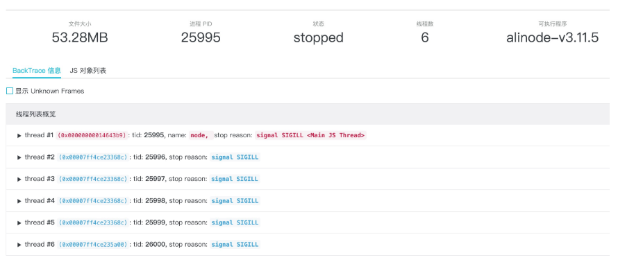 这里第一栏的概览信息看文字描述就能理解其含义,所以这里就不再多做解释了,我们来看下比较重要的默认视图 BackTrace 信息视图,此视图下展示的实际上是 Node.js 应用在 Crash 时刻的线程信息,许多开发者认为 Node.js 是单线程的运行模型,其实这句话也不是完全错误,更准确的说法是 单主 JavaScript 工作线程,因为实际上 Node.js 还会开启一些后台线程来处理诸如 GC 里的部分任务。